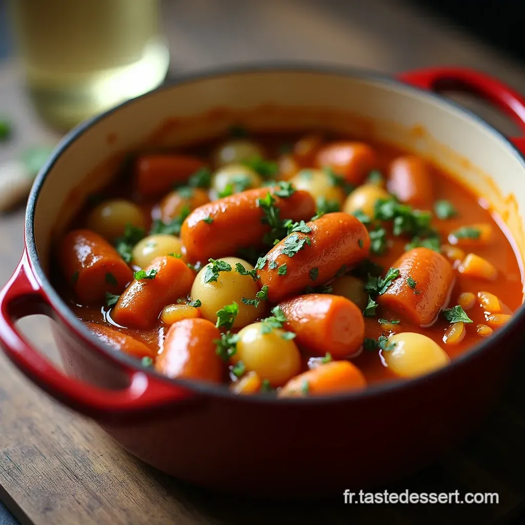 En utilisant une grande cocotte, nous simulons l'environnement idéal pour que les sucs caramélisés des saucisses se mélangent intimement au bouillon et aux légumes, rendant inutile l'assemblage laborieux d'une sauce traditionnelle.