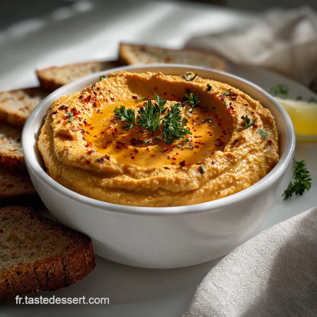 - Le Puits : Étalez le Houmous de lentilles corail dans un plat peu profond et créez un creux au centre avec le dos d'une cuillère.