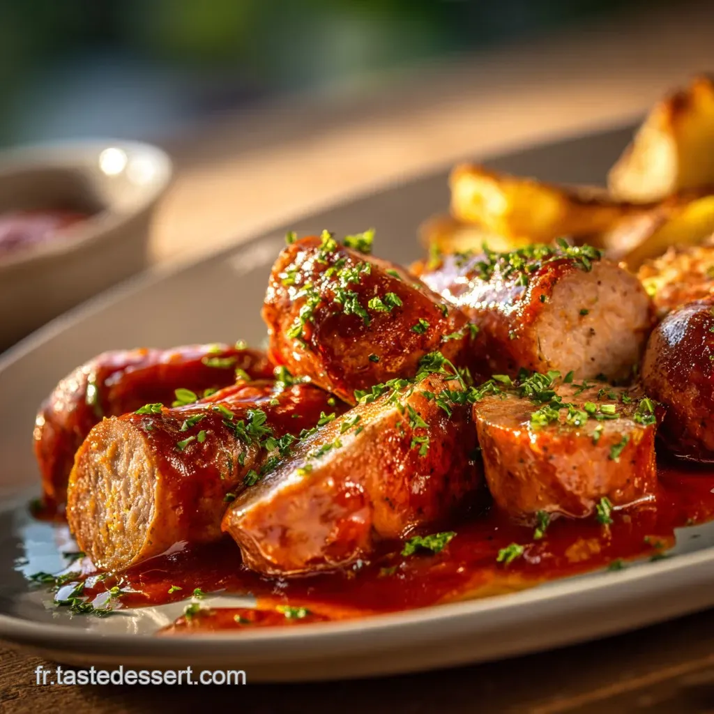 Une poêle ou un grill est indispensable pour saisir la saucisse et lui donner ce croustillant caractéristique. Le temps total estimé pour quatre portions est d'environ 50 minutes, incluant 15 minutes de préparation active et 35 minutes de cuisson, principalement dédiées à la réduction de la sauce.